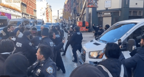 Dozens of NYPD officers helped clear a path for federal law enforcement in Lower Manhattan on Saturday afternoon, arresting and pepper-spraying demonstrators—and themselves—so that a caravan of unmarked vans carrying masked federal agents could drive out of a parking garage and depart west on Canal Street.